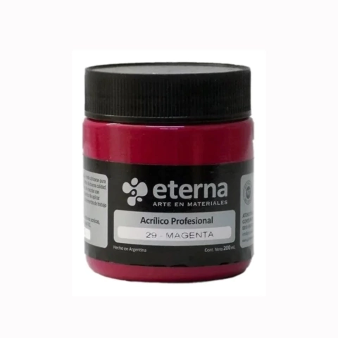 Descripción: Descripción ACRILICO ETERNA PROF 200ML G4 29 MAGENTA Características: El Acrílico Profesional Línea Eterna es una pintura especial para pintar sobre bastidor entelado, y papeles especiales para pintura. Si es necesario debe diluirse con Barniz y Diluyente Eterna que es el producto adecuado para no alterar los niveles de calidad. Es de viscosidad alta ideal para crear texturas o trabajar con técnicas de espatulado. Nuestro acrílico está elaborado con altos porcentajes de resina acrílica pura y pigmentos muy luminosos, lo que genera superficies satinadas y de colores inalterables en el tiempo. La definimos línea Profesional por su excelente respuesta a las mezclas de color y rendimiento adecuado. Producto para uso artístico. La utilización por niños debe ser supervisada por un adulto.