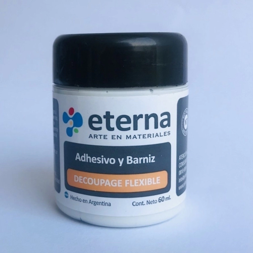 Descripción: ADHESIVO ETERNA DECOUPAGE FLEXIBLE 60ML Descripción El Adhesivo y Barniz para Decoupage Flexible Eterna es un producto versátil diseñado para adherir imágenes impresas a diversas superficies. Este producto es soluble en agua y es ideal para pegar papeles finos como el tissue. Además de su función adhesiva, también sirve como barniz protector cuando se utiliza en esa función. Este producto debe aplicarse en húmedo tanto en superficies rígidas como flexibles. En todos los casos, las imágenes adheridas son resistentes a los lavados con agua y jabones suaves, así como al frote en húmedo o seco. Para obtener los mejores resultados, se recomienda curar el producto con plancha o pistola de aire caliente durante 5 minutos. Sin embargo, es importante tener en cuenta que algunos materiales, como la cuerina, no toleran el calor. El Adhesivo y Barniz para Decoupage Flexible Eterna también puede utilizarse como barniz de protección final en técnicas de carta pesta.