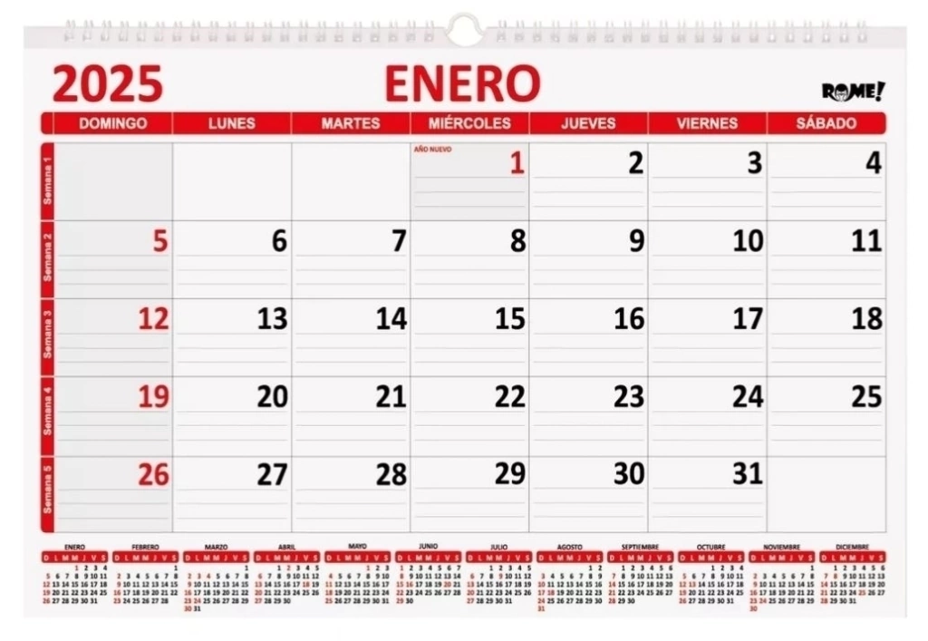 Descripción: ALMANAQUE 2026 ROME A3 APAISADO ROJO Calendario Apaisado Rojo Tamaño A3 42 x 29,7 cm Espiral Cuadriculas para completar. Para organizar actividades personales y familiares, gestionar proyectos, recordar fechas importantes, planificar a largo plazo, hacer un seguimiento de metas, establecer rutinas, etc.