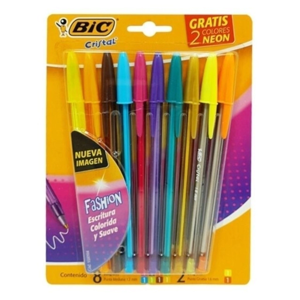 Descripción: Descripción general El pack incluye ocho bolígrafos BIC Fashion en colores surtidos y dos unidades con tinta neón para resaltar apuntes o dibujos con un toque vibrante. Especificaciones técnicas Marca: BIC Modelo: Fashion Unidades: 8 colores surtidos 2 fluo Punta media de 1,2 mm Tinta de secado rápido y resistente a manchas Cuerpo y tapa en plástico cristal que indica el color de la tinta Usos recomendados Escritura cotidiana en cuadernos, hojas sueltas y agendas Subrayado y resaltado de ideas clave Creación de esquemas, mapas mentales y notas creativas Manualidades y lettering básico