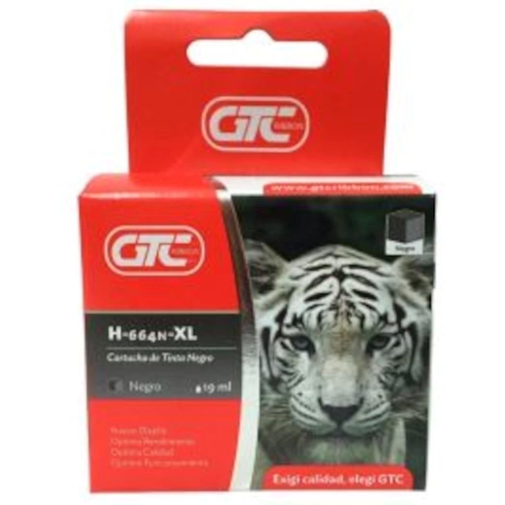 Descripción: Marca:GTC Modelo:664XL Tipo de cartucho:Alternativo Contenido total en volumen:22 mL Color de la tinta:Negro Formato de venta:Unidad Tipo de tinta:A base de agua Rendimiento de páginas:400 Es recargable:No