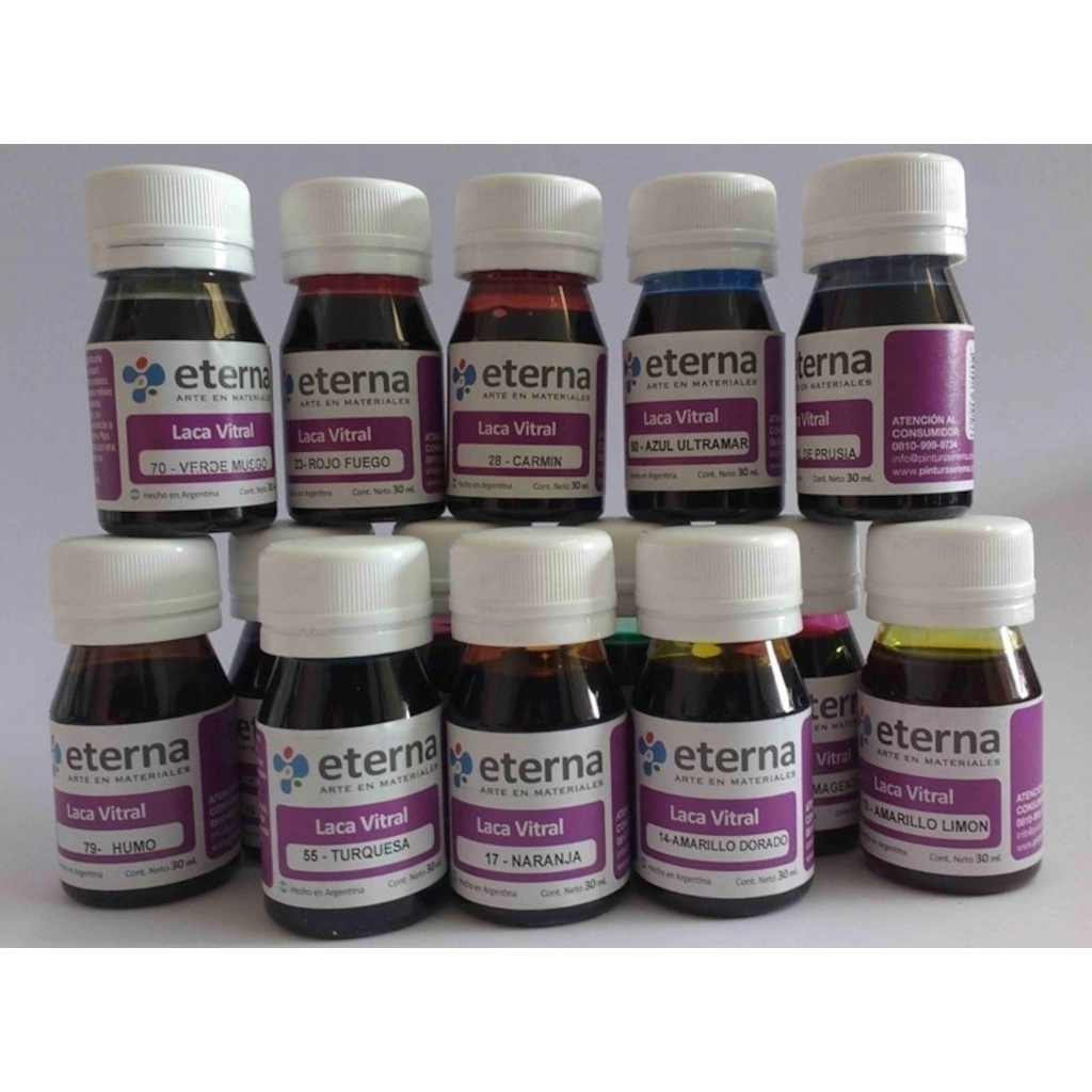 Descripción: LACA VITRAL ETERNA X 30ML AZUL ULTRAMAR Descripción La laca vitral Eterna tiene una fuerte adherencia en superficies lisas, gran resistencia a la luz y a la intemperie. Se pueden utilizar sobre vidrio, papel, cartón, madera, yeso, bizcocho cerámico y algunos metales, obteniendo en todos los casos excelentes resultados y sorprendentes efectos especiales. En caso de ser necesario puede diluirse con Solvente para Laca Vitral Eterna, el mismo que se utilizará para la limpieza de los pinceles. Dentro de los accesorios principales para complementar la Laca Vitral se encuentra la Pasta de Relieve que sirve para realizar los contornos previos imitando el plomo del vitraux de la técnica original.