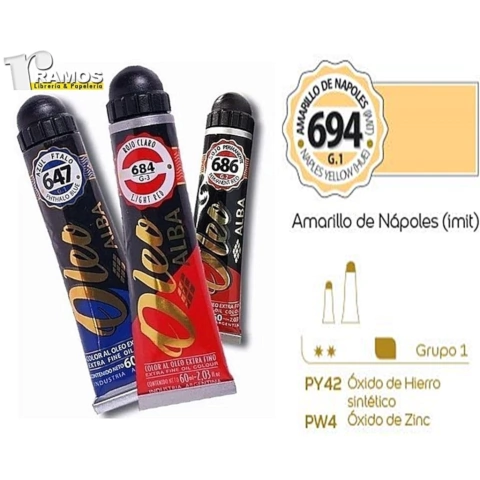 Descripción: Características: OLEO ALBA 60CC G1 AMARILLO DE NAPOLES Los Oleos Alba se elaboran con aceites blanqueados y purificados de primera calidad. La mayoría de los colores están fabricados con un solo pigmento, lo que posibilita obtener colores más limpios por mezcla de los mismos. Todos los pigmentos utilizados son molidos en la cantidad de aceite requerida para asegurar las cualidades de adherencia y cohesión que garanticen el resultado de la obra realizada y de alta resistencia a la luz. . El resultado es una pintura de consistencia "mantecosa" apta para trabajar tanto con pincel, como con espátula.